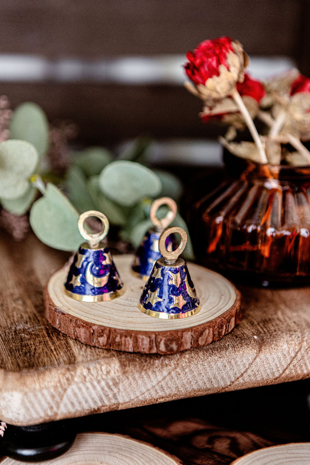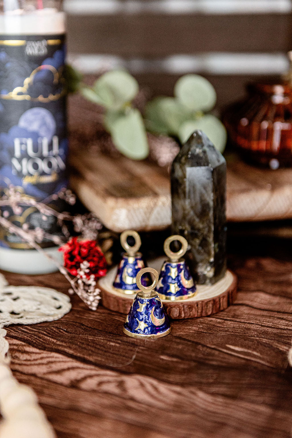 A petite brass bell etched with celestial symbols, perfect for calling in sacred space, adorning your altar, or adding charm to ritual work. Each bell sings with a clear, gentle chime.