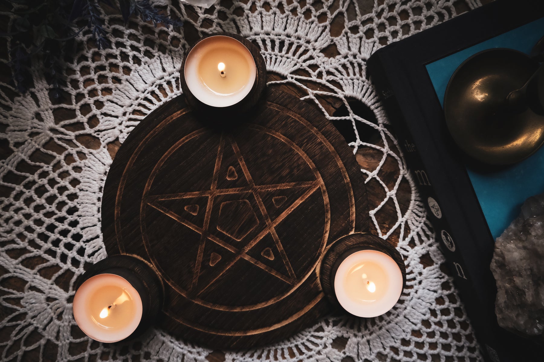 This wooden altar board and candle holder holds three tealight candles and measures 6 approximately 7 inches across.