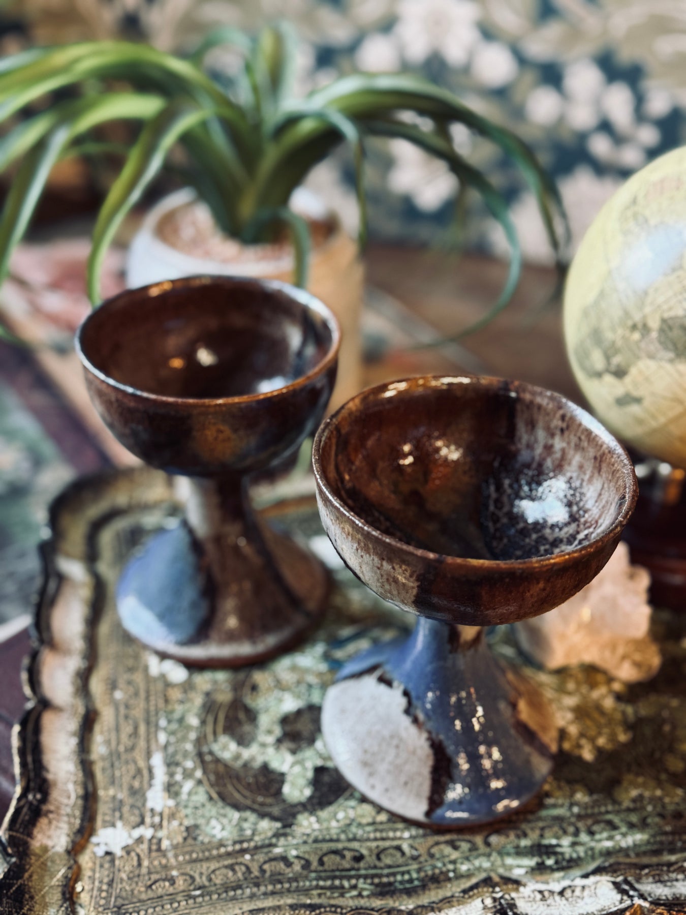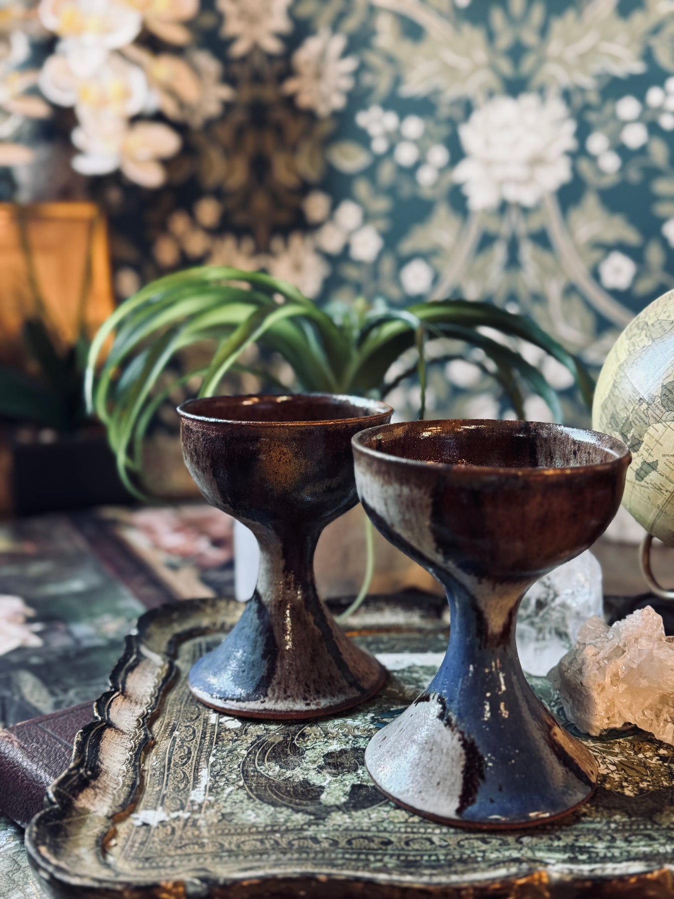 Set of two hand-thrown ceramic goblets with rounded bowls and flared pedestal bases, finished in a layered glaze with natural variation.