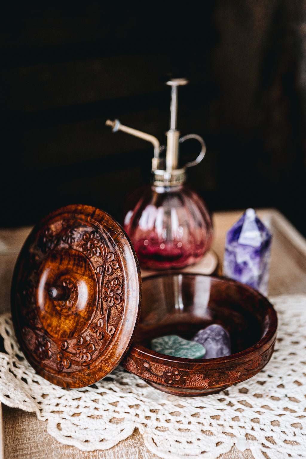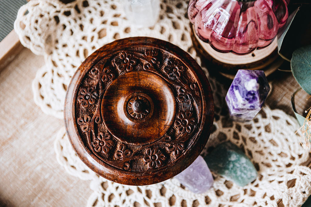 Adorn your sacred space with this unique floral carved bowl with lid. Deep enough to store special jewelry pieces or altar keepsakes, this would also make a great addition to a kitchen witch set.