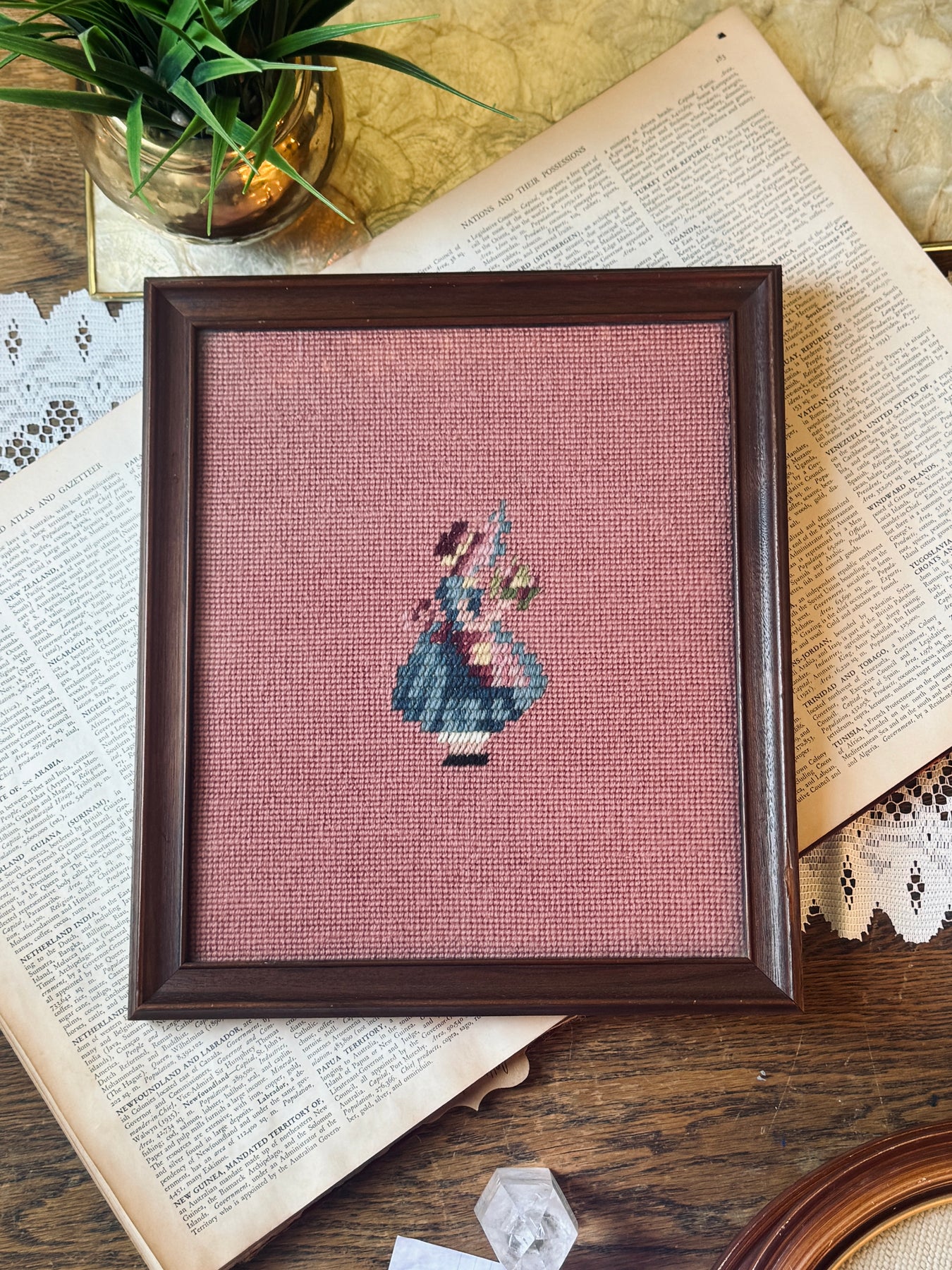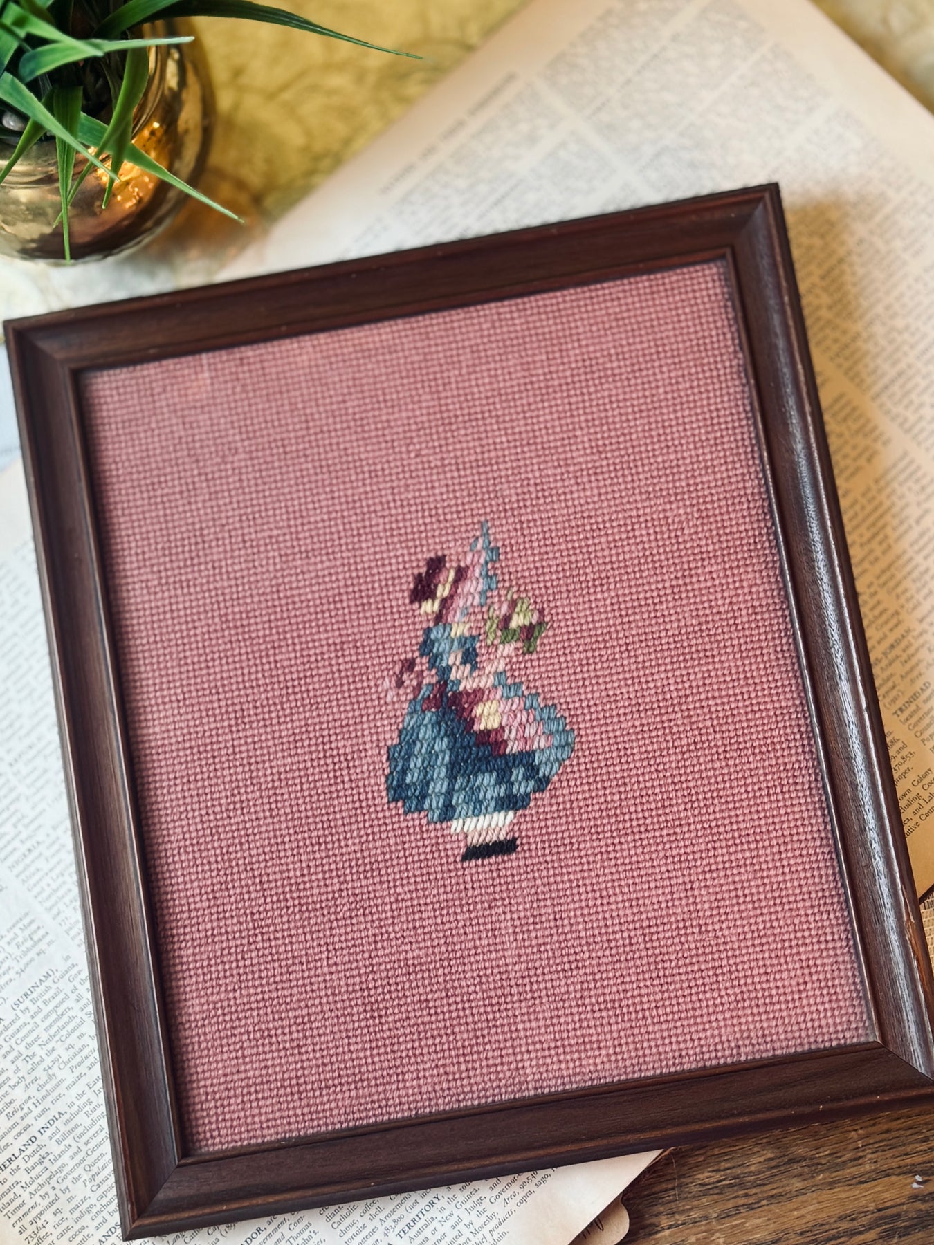 A vintage needlepoint featuring a small floral urn motif stitched in soft blues and pinks against a dusty rose ground. Framed in dark wood, it has a sweet, understated folk-art feel with a gently timeworn charm.