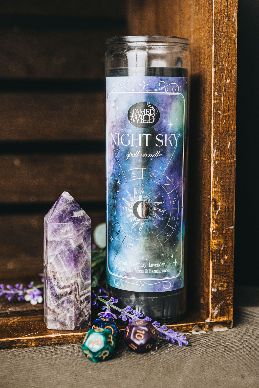 Our Night Sky scented soy wax candle is infused with lemon, rosemary, lavender, freesia, oak moss, and sandalwood. Light this candle while working with any moon phase or celestial rituals. These scents blend together to cleanse and amplify your highest intentions while working under the night sky.