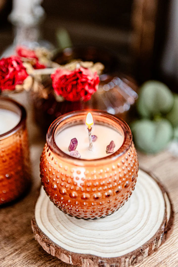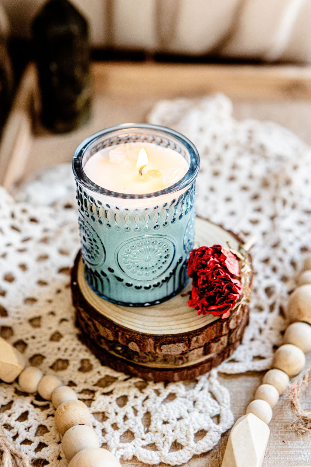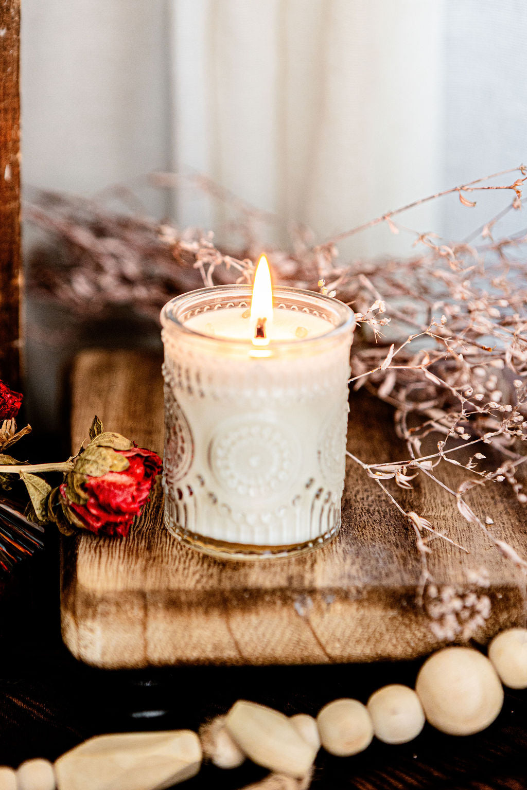 This pretty little vintage-inspired glass jar holds a scented, soy wax candle.