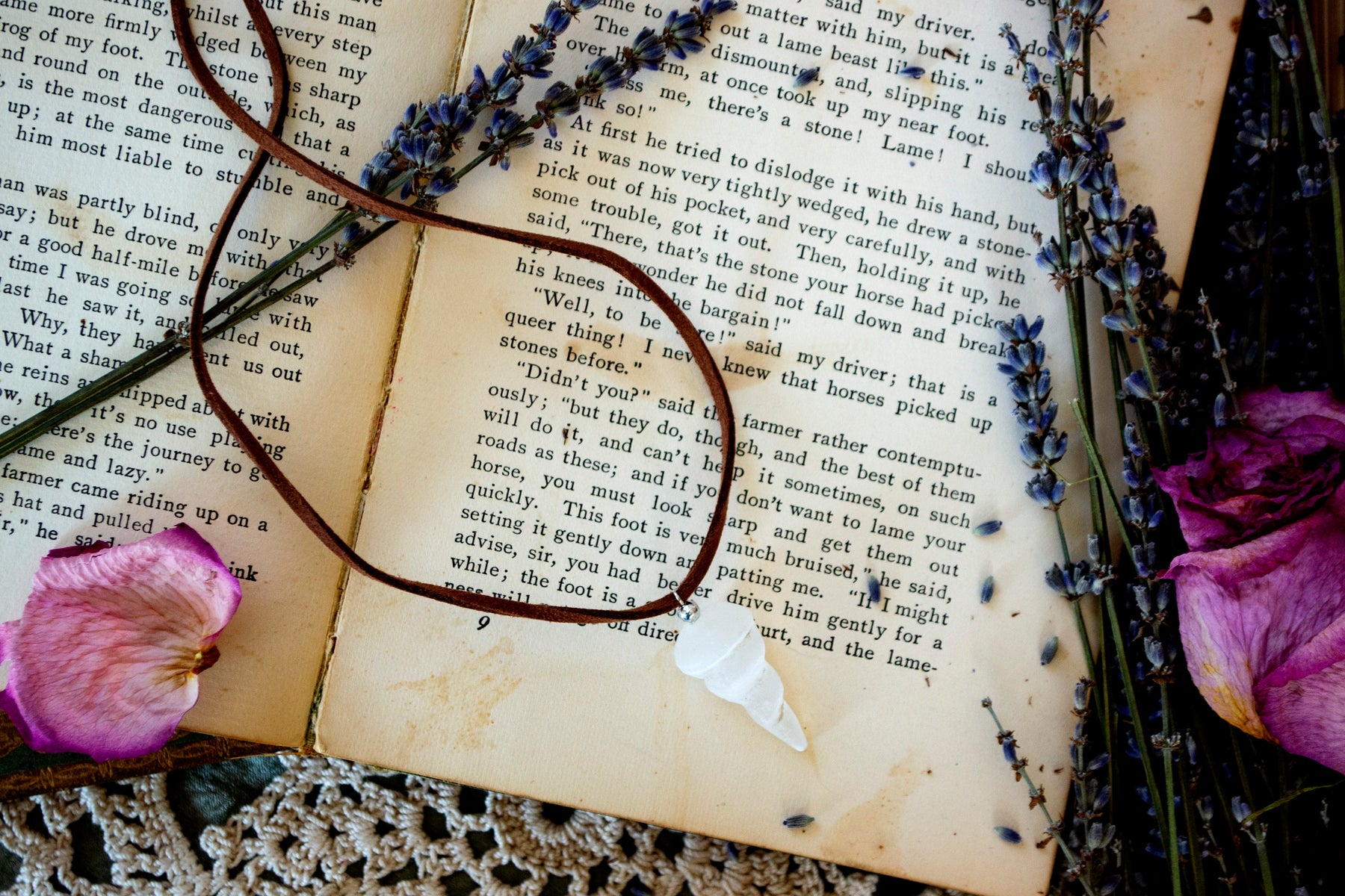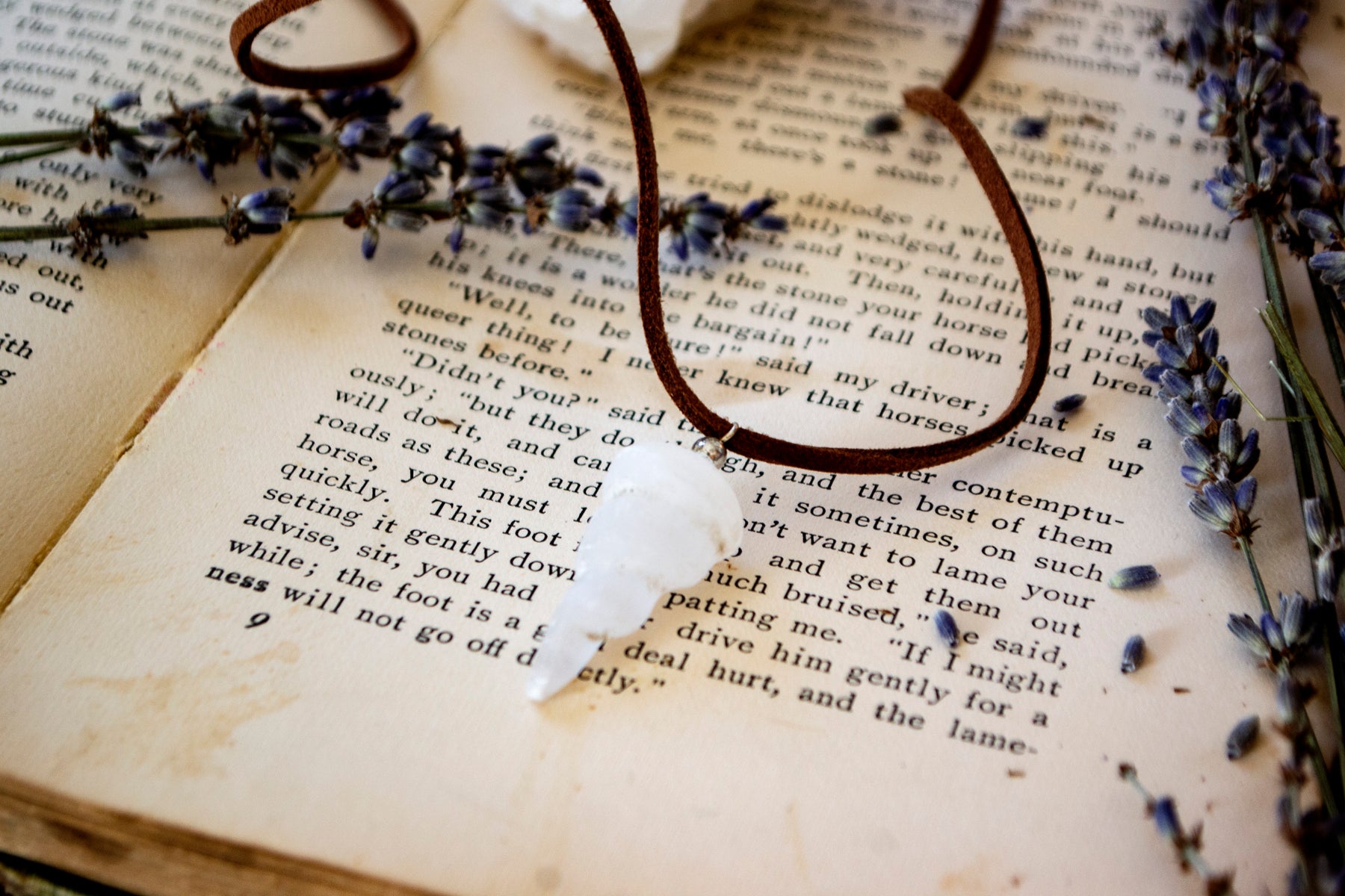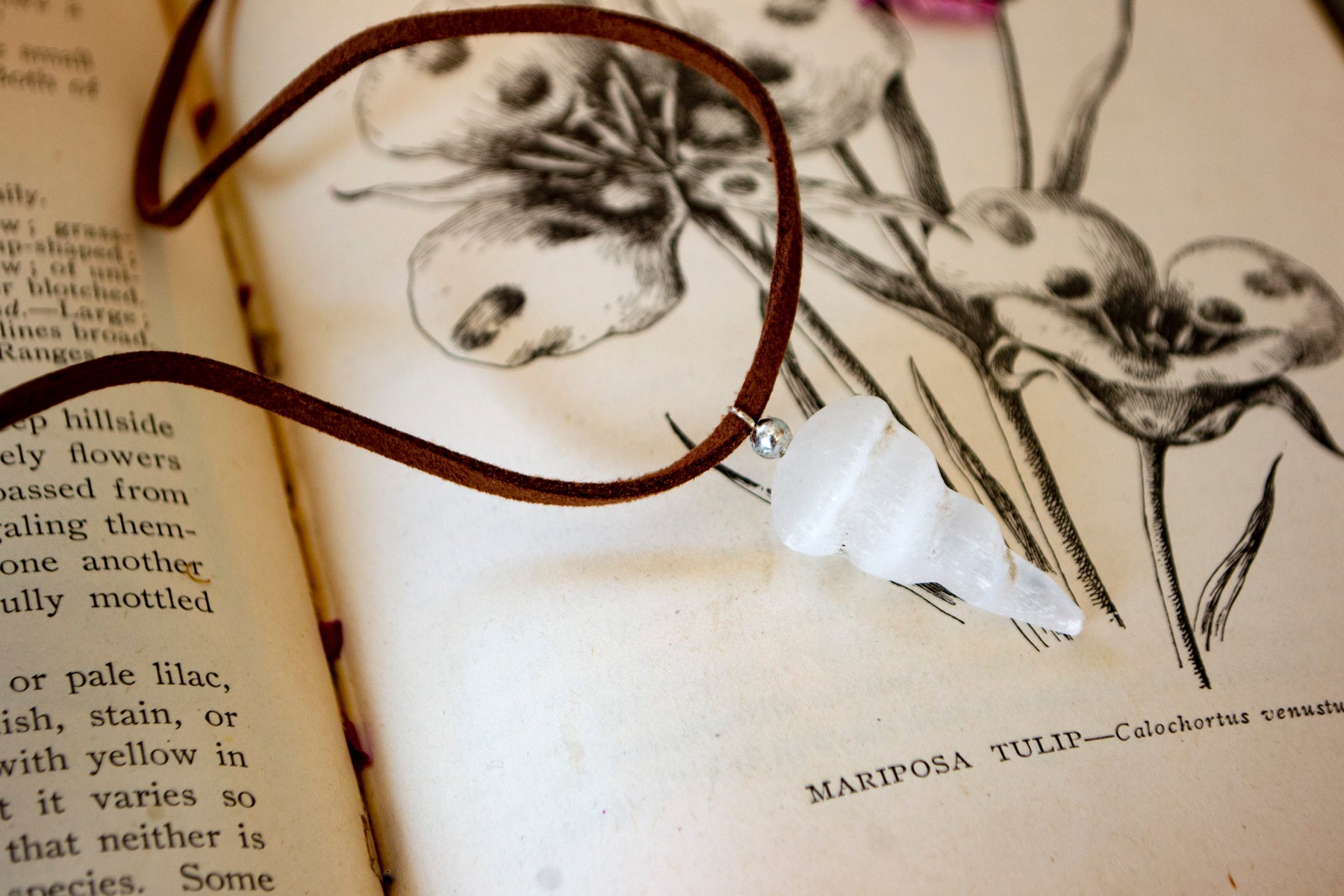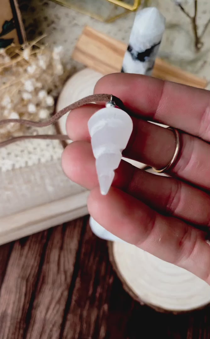 2 inch selenite spiral pendant comes with a brown cord.