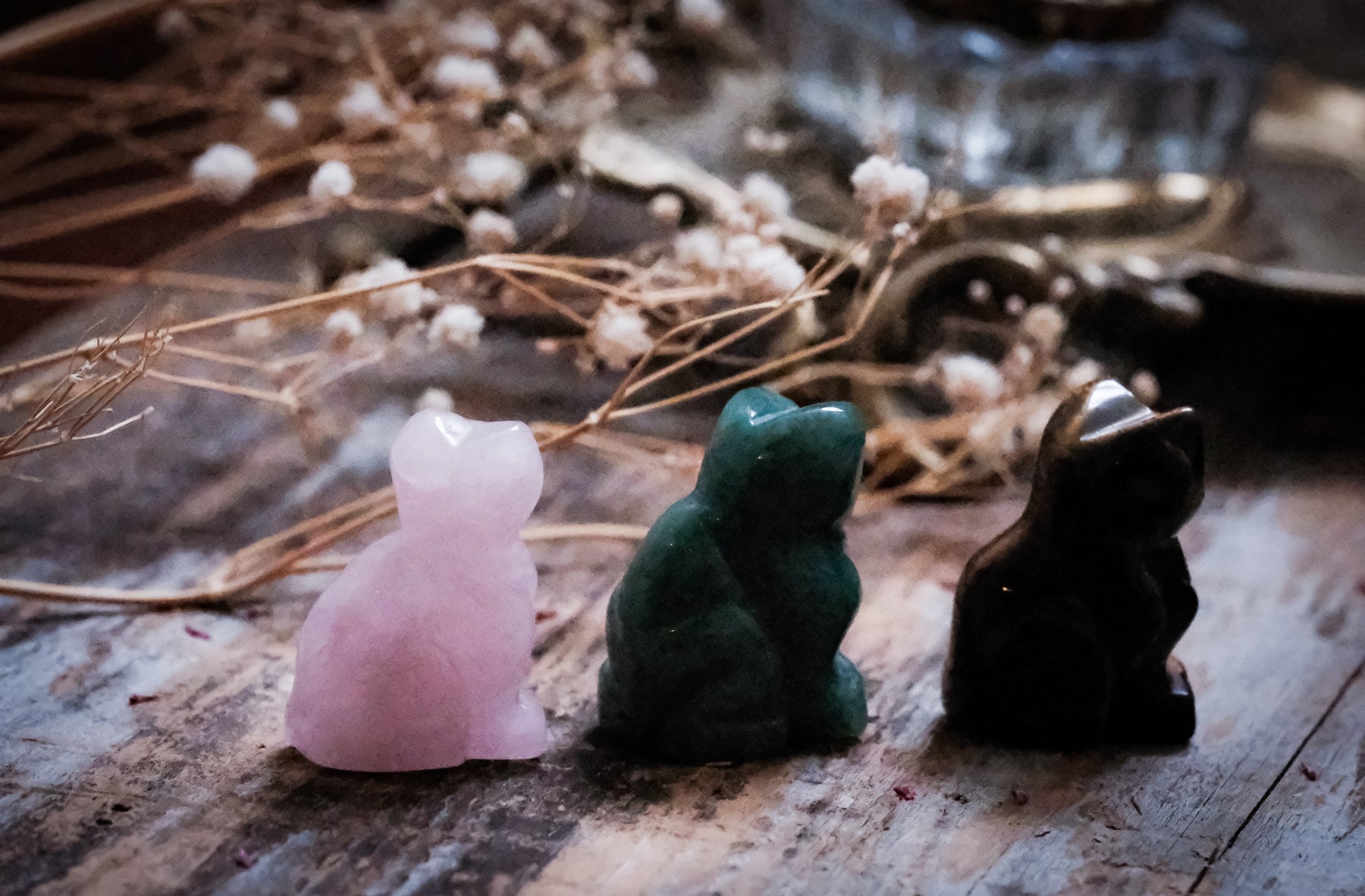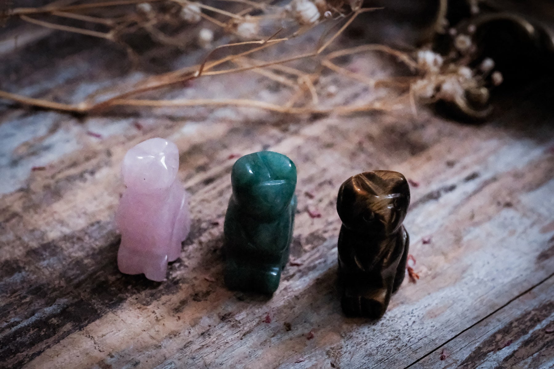 Options include Tigers Eye, Rose Quartz or Green Aventurine. Measures 2 inches tall & chosen at random.