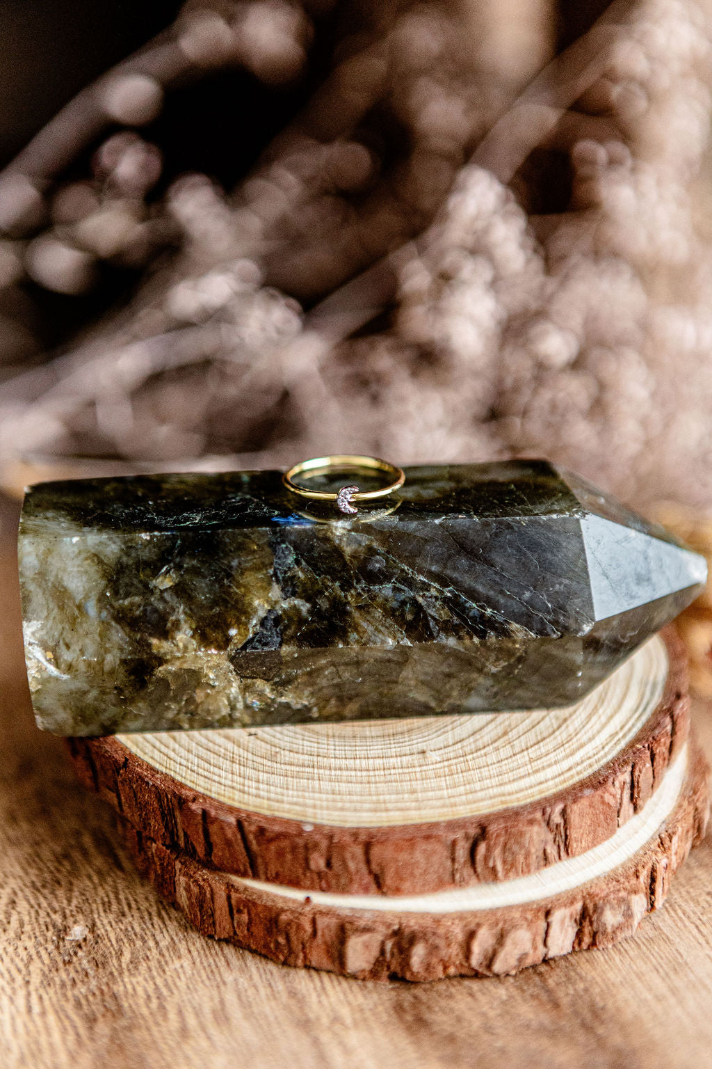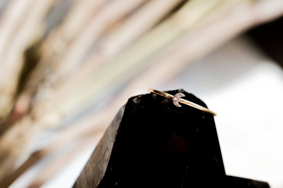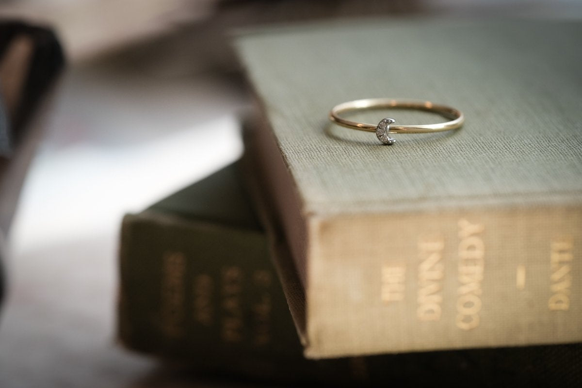 This 14k gold ring has the daintiest of crescent moons made of  pave diamonds. Its delicate size makes it the perfect stacking or midi ring.