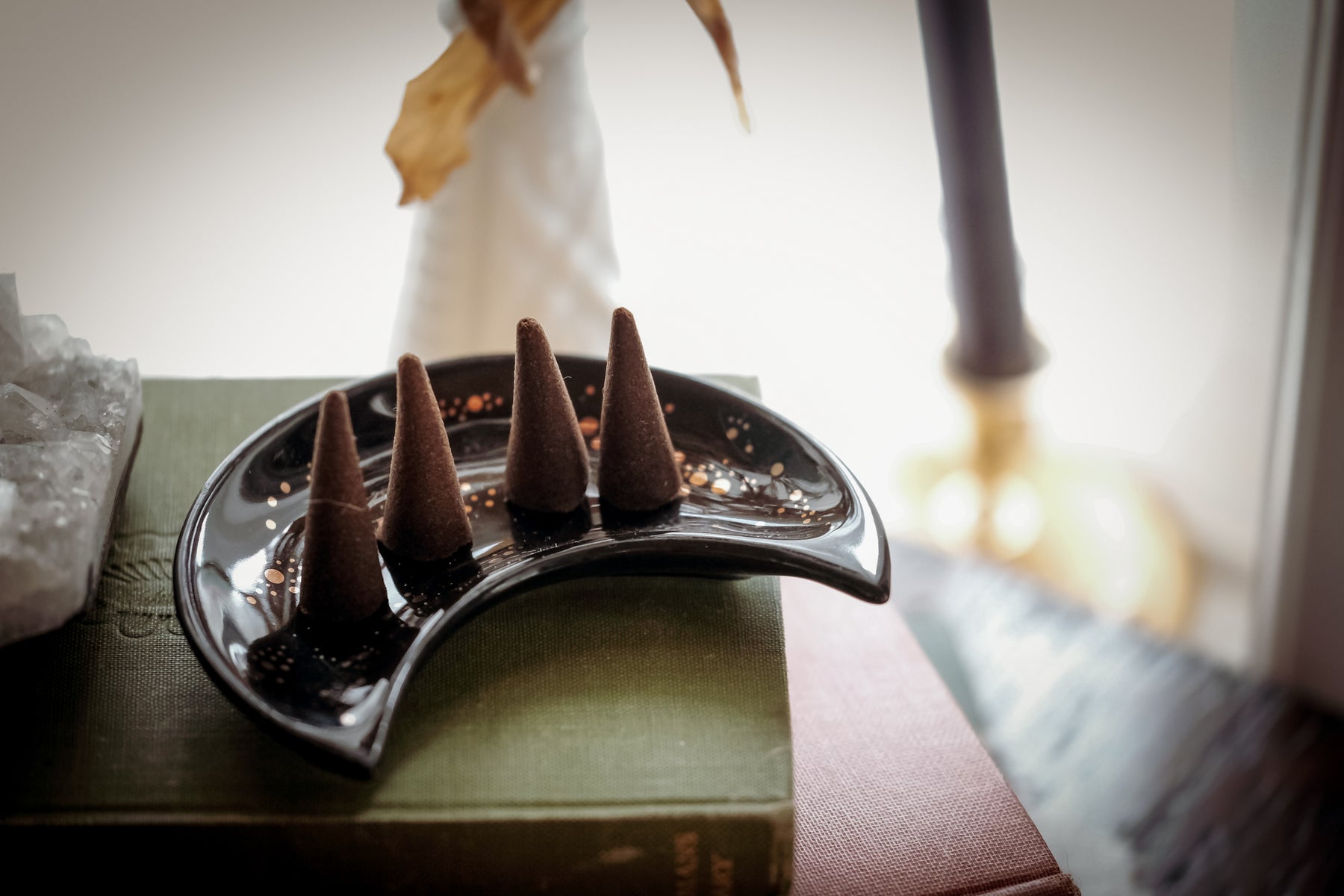 This little crescent moon plate is perfect for your rings, burning incense or your intentions. Measures 4 inches long.